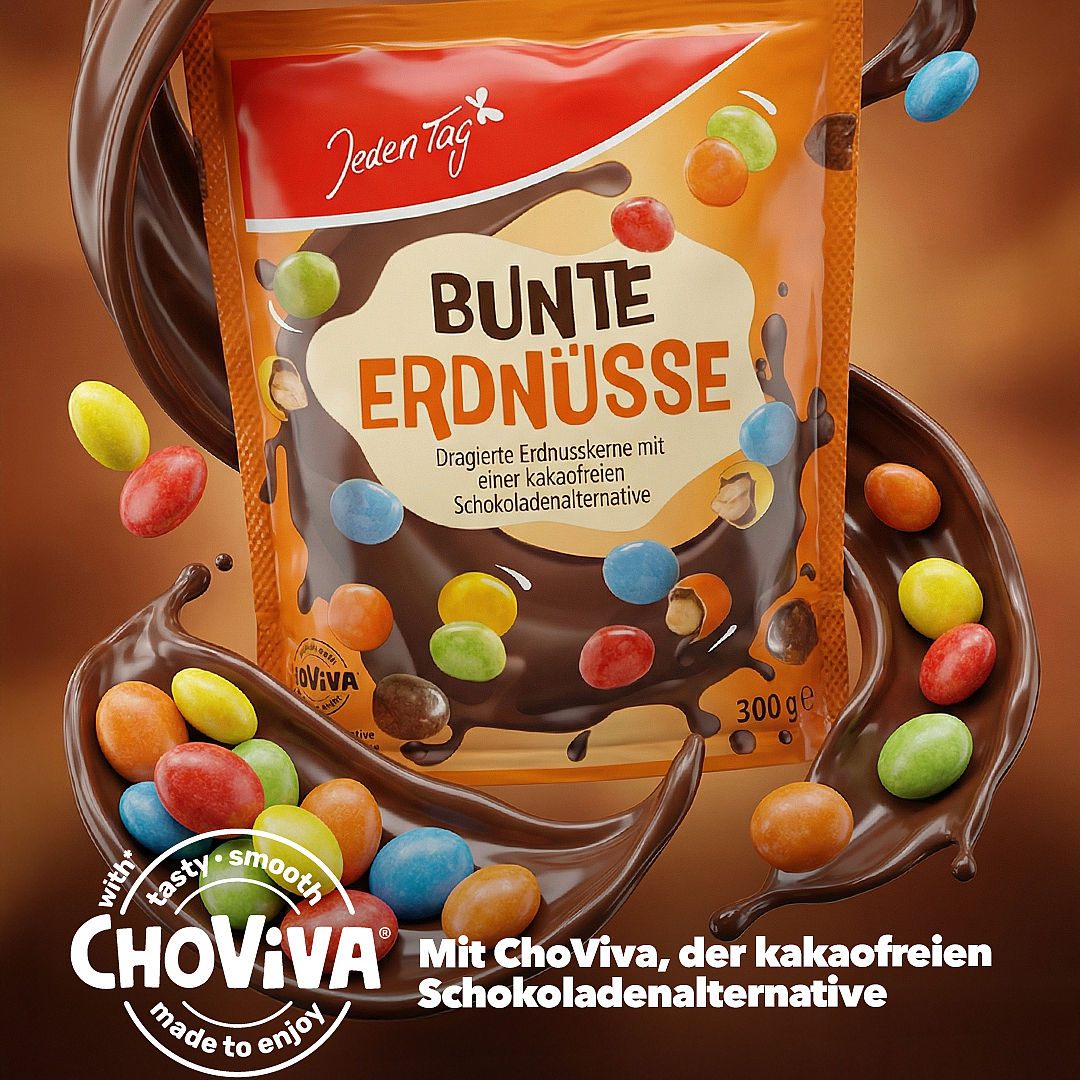 Sonnenblumenkerne statt Kakao: Bei den Bunten Erdnüssen setzt Jeden Tag auf die kakaofreie Schokoladenalternative ChoViva. Aus natürlichen Zutaten hergestellt, superlecker und mit deutlich geringerem CO2-Abdruck im Vergleich zu herkömmlicher Schokolade!