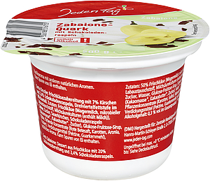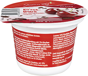 - 50 % FRISCHKÄ(MAGERMILCH, mikrobieller Labaustauschstoff, Milchsäurekulturen (enthält MILCH)), SAHNE, Zucker, Wasser, Glukose-Fruktose-Sirup, Schokoladenraspeln (Kakaomasse, Kakaobutter, Zucker), Stärke, Verdickungsmittel (Pektine, Guarkernmehl), natürliches Vanillearoma mit anderen natürlichen Aromen.