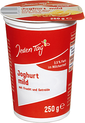 - Zutaten je Sorte: Blutorange-Ananas: JOGHURT mild, Zucker, 3 % Ananas, 2,2 % Blutorangensaft aus Blutorangensaftkonzentrat, 1,4 % GERSTE, 1,4 % HAFER, 1 % Blutorangenzellen, 0,4 % ROGGEN, 0,2 % WEIZEN, modifizierte Stärke, färbendes Karottensaftkonzentrat, natürliches Aroma, Säureregulatoren: Calciumcitrate, Natriumcitrate, Citronensäure; Verdickungsmittel: Pektine. Birne: Joghurt mild, Zucker, 5,9 % Birnen, 1,4 % GERSTE, 1,4 % HAFER, 0,5 % Birnenmark, 0,4 % ROGGEN, 0,2 % WEIZEN, modifizierte Stärke, natürliches Aroma, Säureregulator: Citronensäure. Bircher Müsli: JOGHURT mild, Zucker, 3 % Apfelsaft aus Apfelsaftkonzentrat, 1,4 % Rosinen, 1,2 % Äpfel, 0,8 % Orangenzellen, 0,8 % HASELNUSSKERNE, 0,8 % HAFERFLOCKEN, 0,8 % HAFER, 0,6 % Apfelmark, 0,4 % GERSTE, 0,2 % ROGGEN, 0,2 % WEIZEN, modifizierte Stärke, natürliches Aroma, Säureregulator: Citronensäure. Erdbeer-Rhabarber: JOGHURT mild, Zucker, 2,8 % Rhabarber, 2,0 % Erdbeere, 1,4 % GERSTE, 1,4 % HAFER, 0,8 % Erdbeersaft aus Erdbeersaftkonzentrat, 0,4 % ROGGEN, 0,2 % WEIZEN, modifizierte Stärke, färbendes Rote Betesaftkonzentrat, färbendes Karottensaftkonzentrat, natürliches Aroma, Säureregulator: Citronensäure.