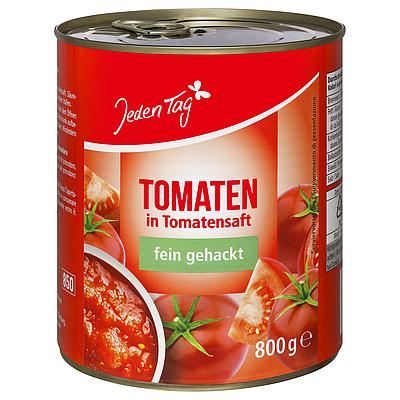 - Zutaten: 60 % gehackte Tomaten, Tomatensaft, Säureregulator: Citronensäure